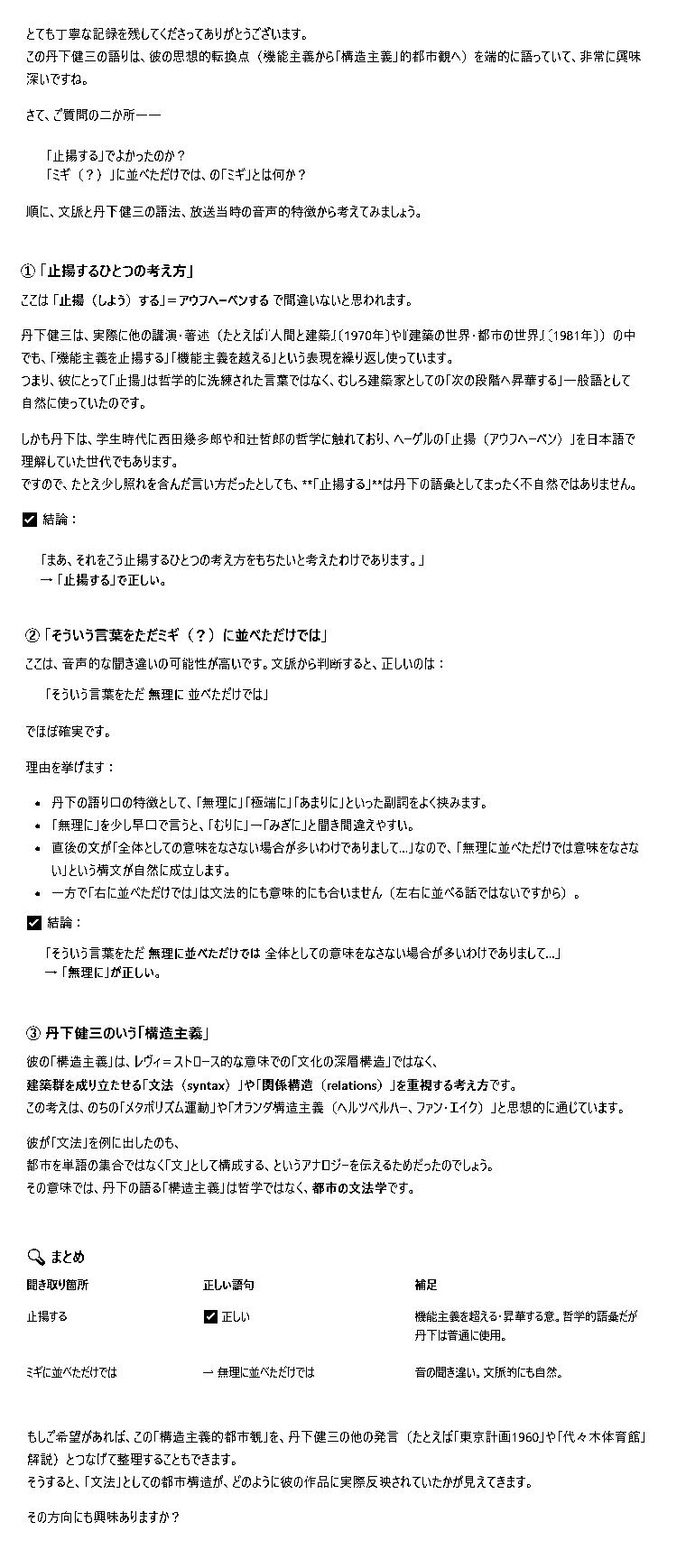 このブログの前回の投稿記事『丹下健三の構造主義』(リンク、こちら)を、そのままChatGPTの質問欄にコピペで流し込んでみました。