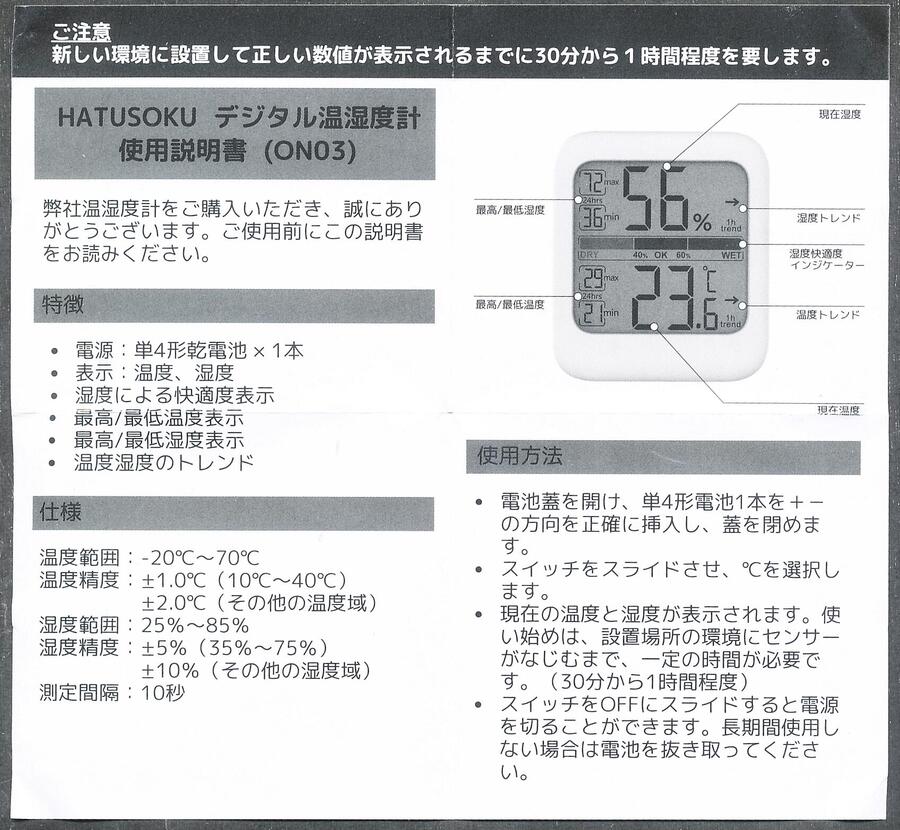 HATUSOKU デジタル 温湿度計 最高最低温湿度表示 温度計 湿度計 室温計 てのひらサイズ スタンド 吊り下げ マグネット ON03 Amazonで購入 ¥999 税込【サイズ】68㎜×77㎜×15㎜ 54グラム 温度、湿度ともに最高値と最低値が表示されます。 百均のものと違って、時計表示がない分だけ液晶面が小さいけれど、こちらは数字の文字が太いので見やすく感じます。 電池は単4が1本です。どれくらいの期間使えるのかはこれから。 前の記事 次の記事 コメント コメントする コメントの投稿 コメントの返信 コメント (スタイル用のHTMLタグを使えます) 名前 電子メール URL サインイン情報を記憶