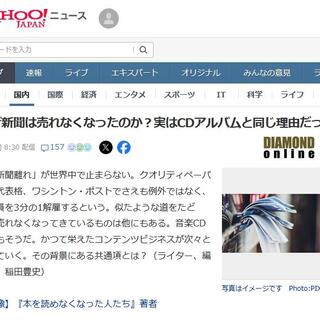今朝、ヤフーニュース(無料版)をながめていると、この本の著者稲田豊史さんが書いた記事(「ダイヤモンド・オンライン」からの転載)をたまたま見つけました。「なぜ新聞は売れなくなったのか?実はCDアルバムと同じ理由だった」は、この本に書かれていたのと同じ内容です。